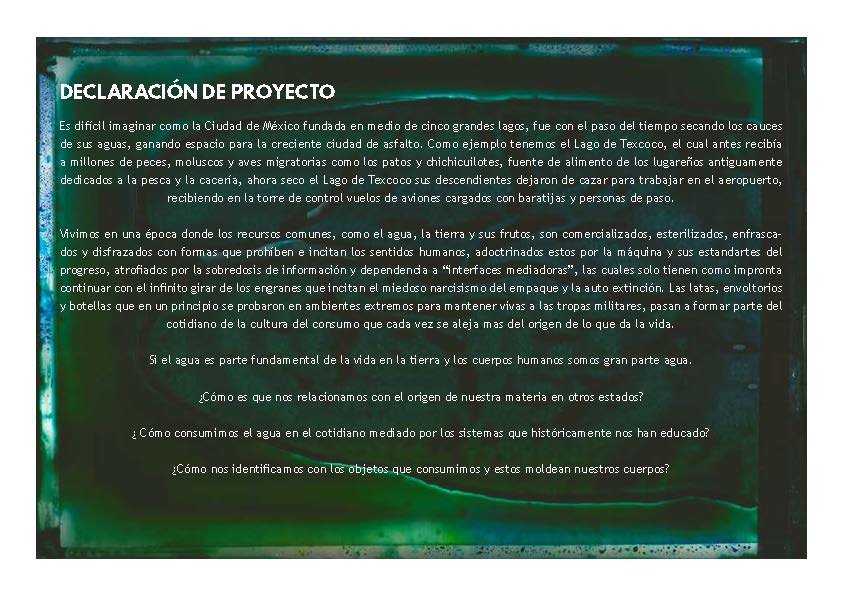 Si el agua es parte vital en la Tierra y los cuerpos humanos somos gran parte agua, ¿cómo es que nos relacionamos con el origen de nuestra materia en otros estados físicos? ¿Cómo consumimos el agua en el cotidiano mediado por los sistemas que históricamente nos han educado? ¿Cómo nos identificamos con los objetos que consumimos y que moldean nuestros cuerpos?